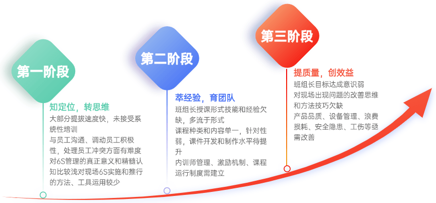 随着公司进一步发展,为了满足公司对班组长团队管理的高要求,通过前期的访谈、跟班、新员工培训、问卷调查、资料收集、数据分析等全方位的深度调研,量身定制了三个阶段的《杰出班组长能力提升》系统训练项目推进地图。